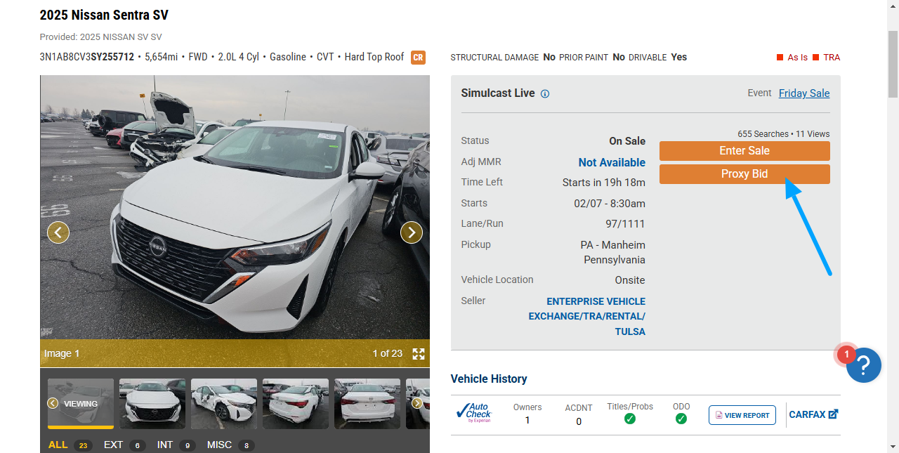 When you find a vehicle you wish to bid on, simply click on “Proxy Bid” either from the search results page or the vehicle detail page. Before placing your bid, it’s advisable to review the proxy bidding rules. Select the account you’re bidding on behalf of, enter your maximum bid in increments of $25, and submit your bids.