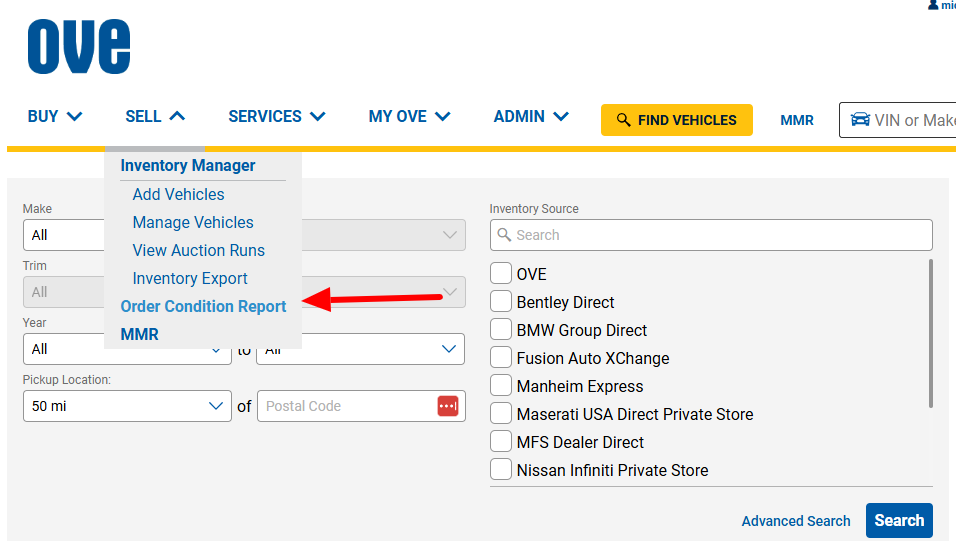 - Log in to OVE.com, go to Sell, and select Order Condition Report from the drop-down menu.